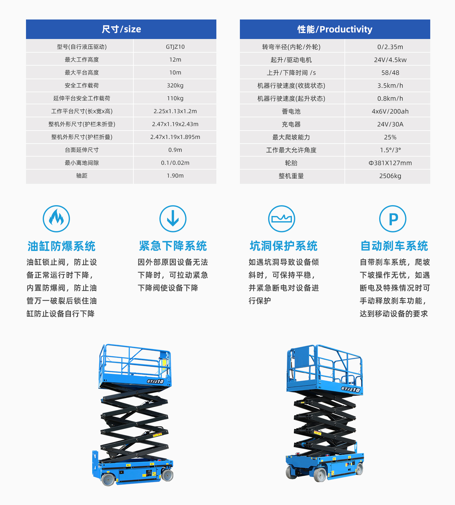 工作高度10m,平臺(tái)承載能力320kg,爬坡能力25%,移動(dòng)靈活,升降平穩(wěn),操作簡(jiǎn)單,廣泛應(yīng)用于廠房建設(shè),設(shè)備維修,建筑保養(yǎng)。