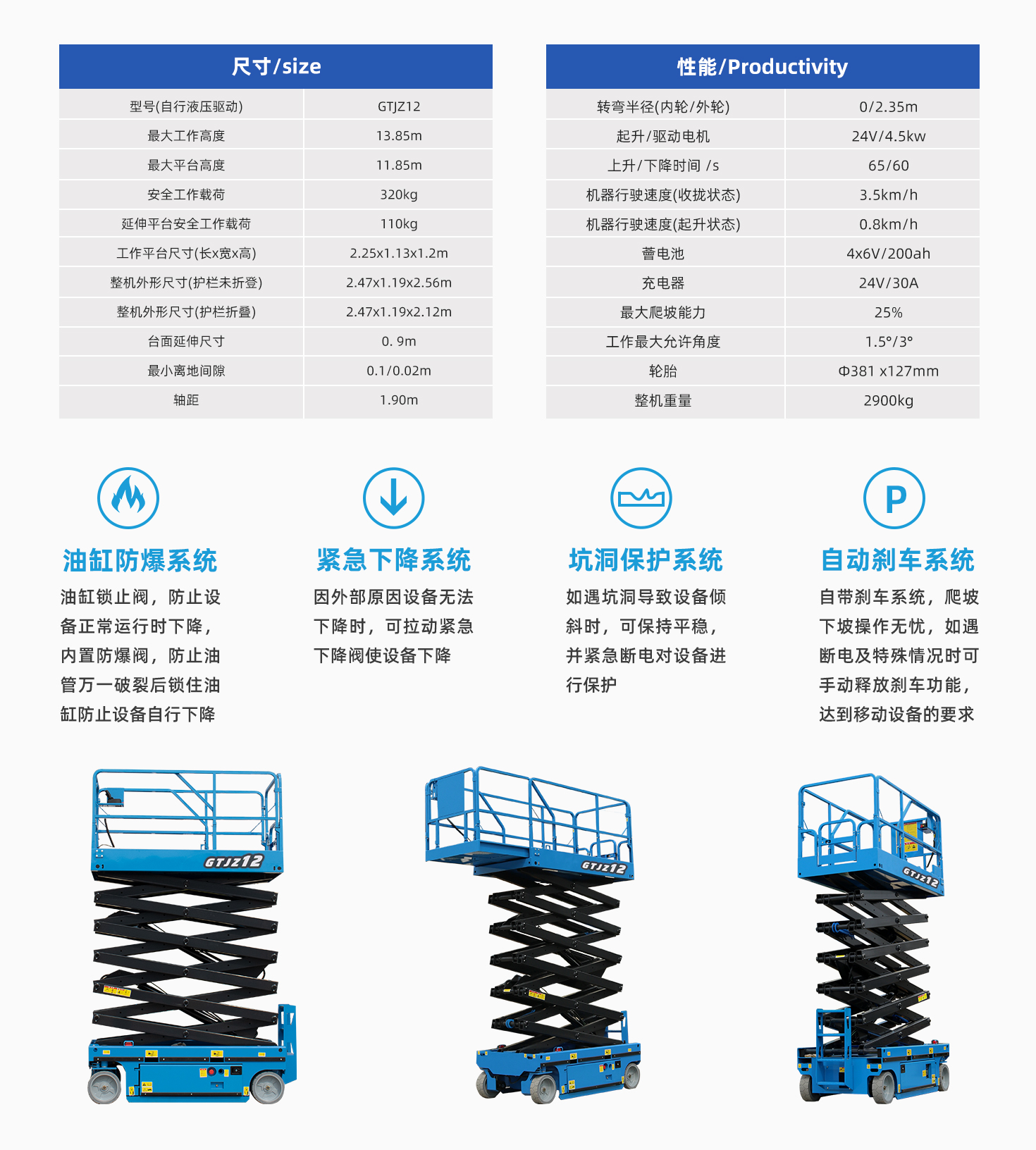 工作高度11.85-13.85m,平臺承載能力320kg,爬坡能力25%,移動靈活,升降平穩(wěn),操作簡單,廣泛應(yīng)用于廠房建設(shè),設(shè)備維修,建筑保養(yǎng)。