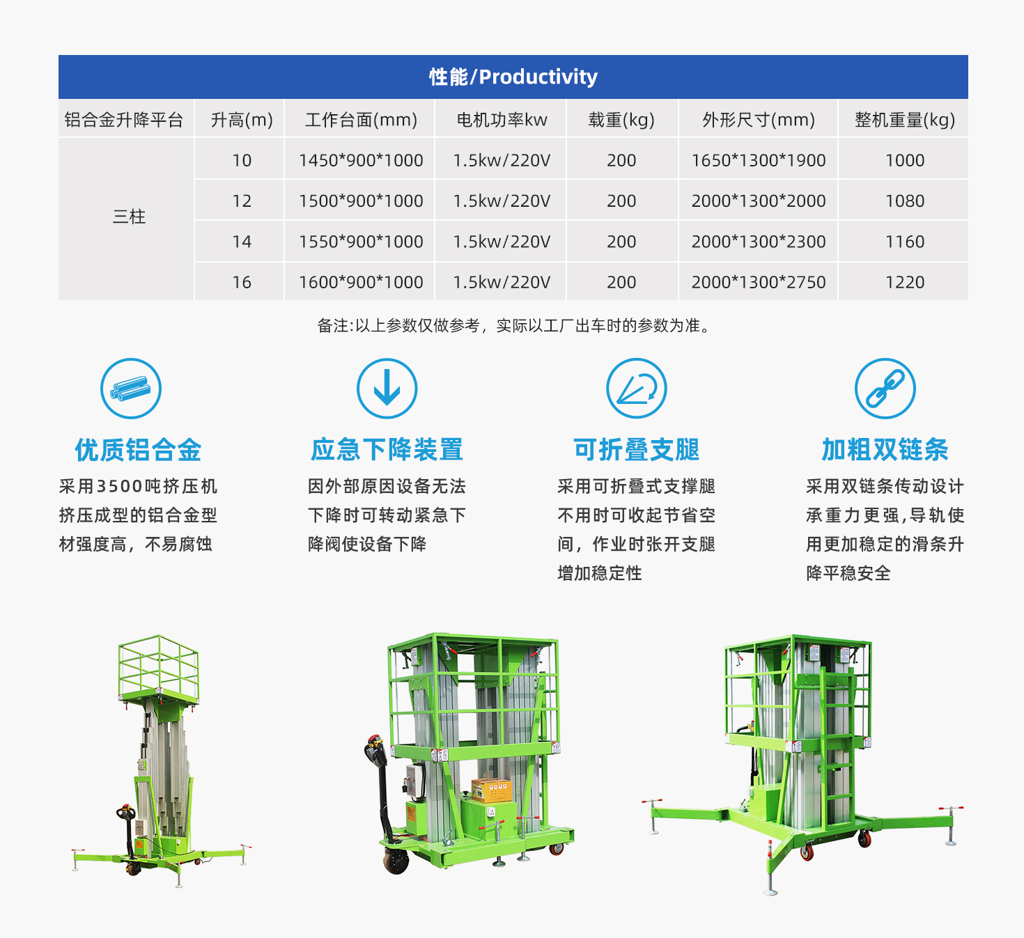 采用高強(qiáng)度優(yōu)質(zhì)鋁合金材料,具有造型美觀、體積小、重量輕、升降平穩(wěn)、安全可靠等優(yōu)點(diǎn)。穩(wěn)定性極好,運(yùn)轉(zhuǎn)靈活,推行方便。它輕盈的外觀,能在極小的空間內(nèi)發(fā)揮最高的舉升能力。